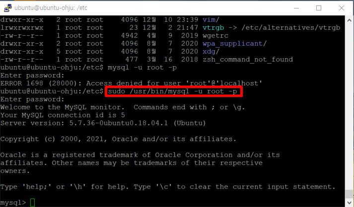 ---- 이 후로 접속이 안 되는 오류가 있어서 몇 가지 시도하다 성공했습니다.