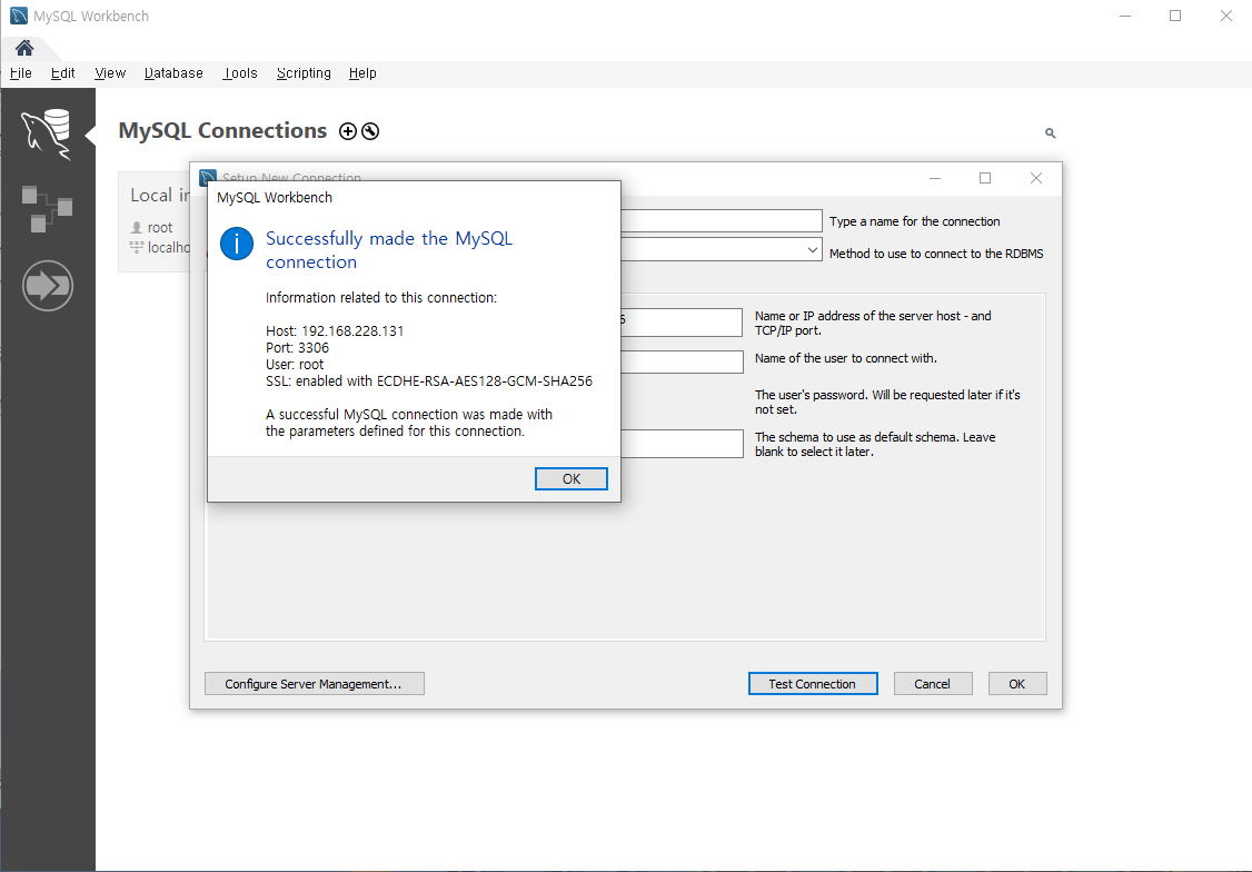 이제 값을 맞게 입력하고 Test Connection을 눌러보면