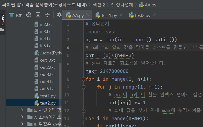 이렇게 같은 문제도 test1, test2 만들어 가면서 알고리즘 원리를 이해하고 반복해서 풀어보고 있습니다.