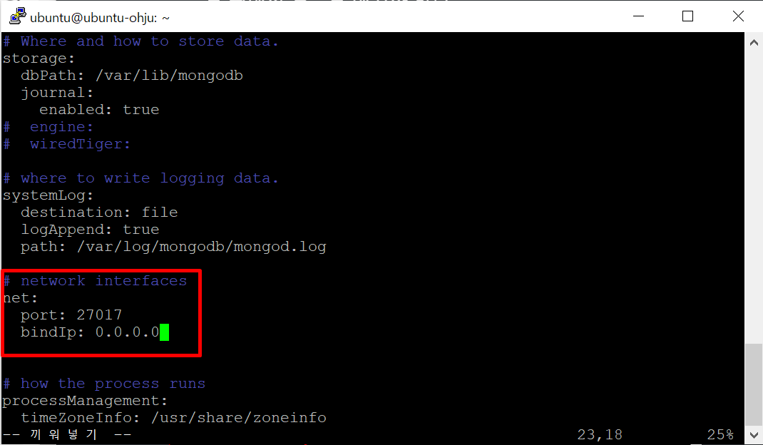 - vi 편집기로 mongod.conf에 들어간다.