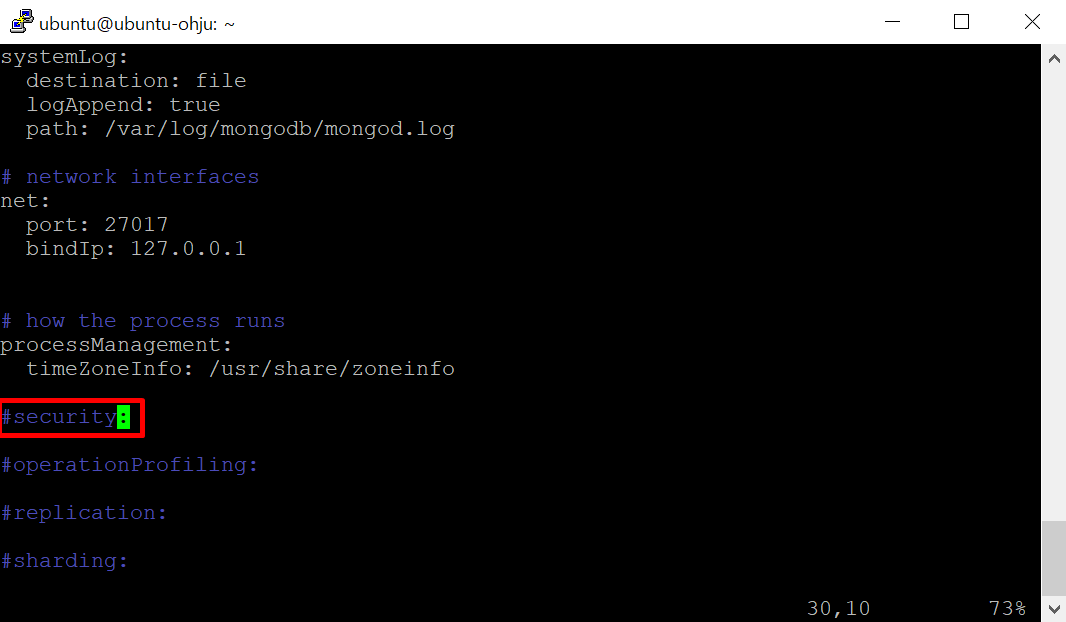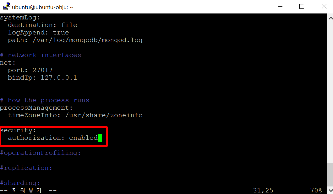 - 아래로 스크롤을 좀 내려보면 #security 항목이 주석처리 되어 있다. 주석을 풀어주고 authorization: enabled을 추가해 준다.