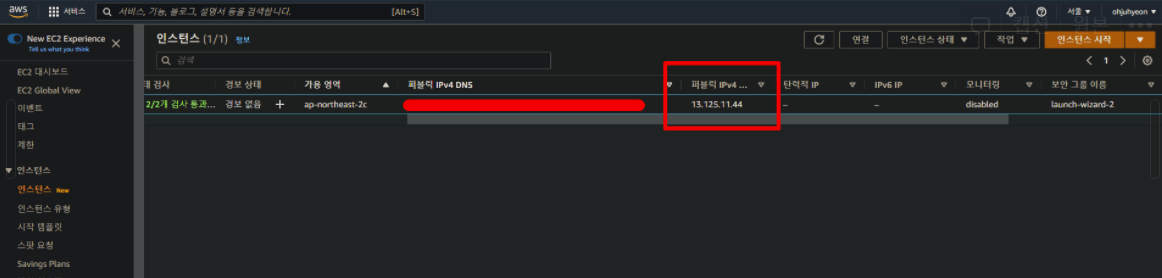 - 퍼블릭 IP는 인스턴스를 중지하거나 재시작하면 변경되므로 추후에는 탄력적 IP를 생성하고 연결해서 사용하면 된다.