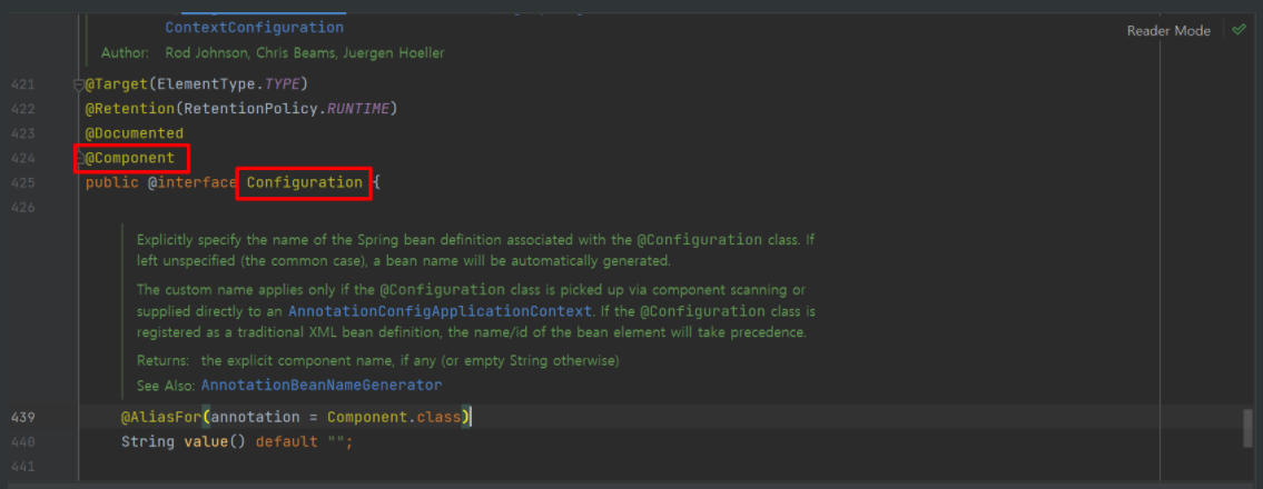 - 사진을 보면 @Configuration도 @Component가 붙어있어서 컴포넌트 스캔의 대상이 된다.