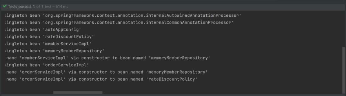 - 테스트 코드를 작성해서 돌려 로그를 보면 컴포넌트 스캔이 정상 작동하는 것을 확인할 수 있다.