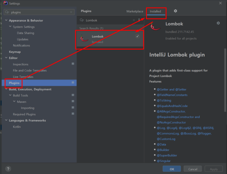 - 셋팅에 들어와서 롬북을 검색해서 설치해주고 제대로 되어 있는지 확인한다.