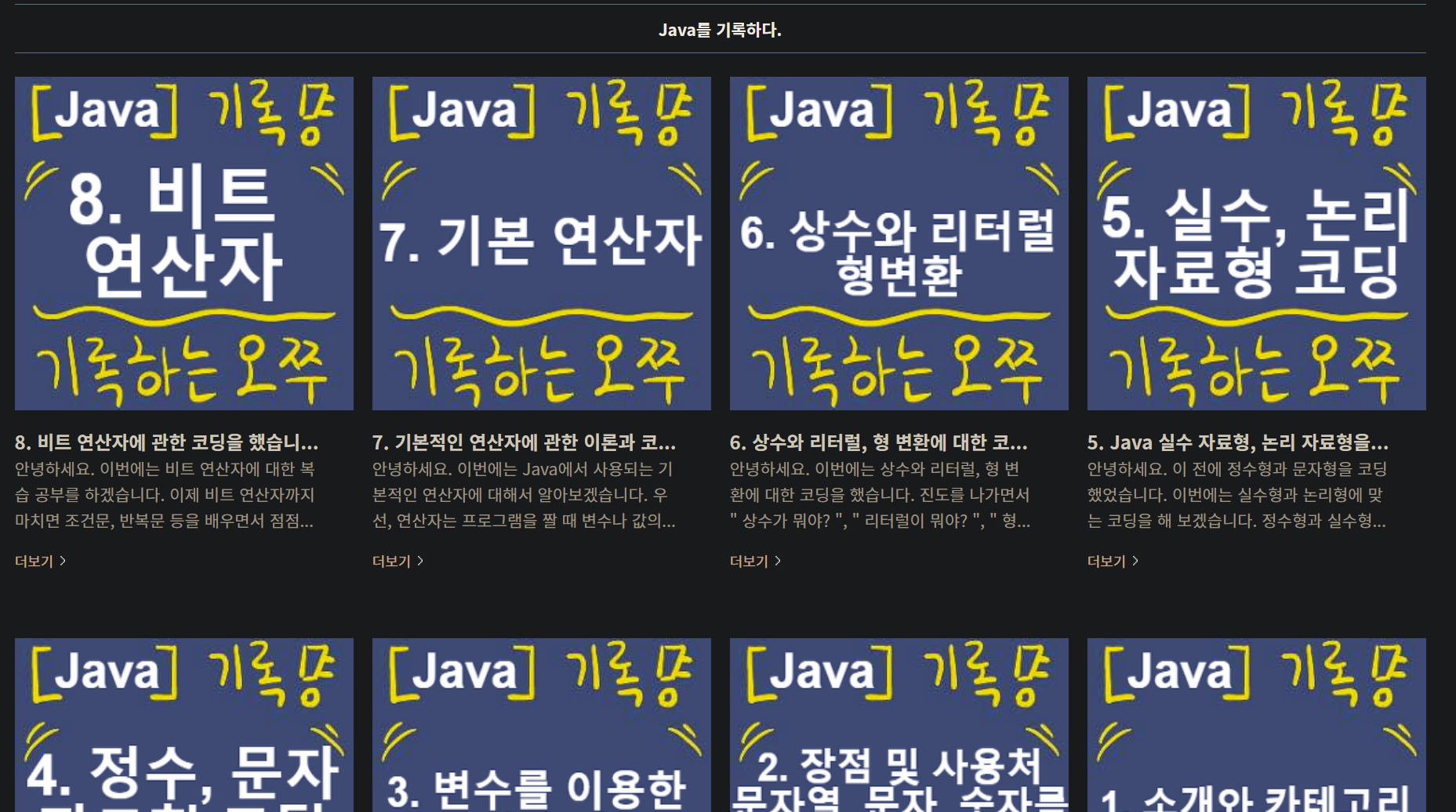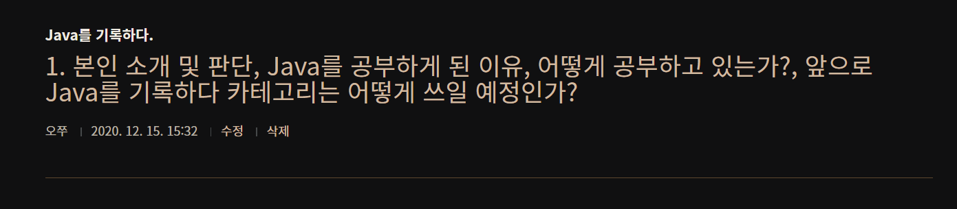 지금 이 블로그가 대단한 블로그는 아니지만 이 블로그를 만들기까지 여러 블로그를 거쳐왔다. 위 사진은 예전에 처음으로 공부하게 된 스토리를 담고 있는 블로그이다. 딱히 내용은 없다. 이 때는 내가 학교를 다니기도 전이었고 그냥 막연하게 Java 책을 구매해서 강의를 듣고 있던 때 였던 것 같다. 아마 20년 12월 15일 15시 32분 저게 내가 개발자로서 남긴 첫 번째 기록인 것 같다.