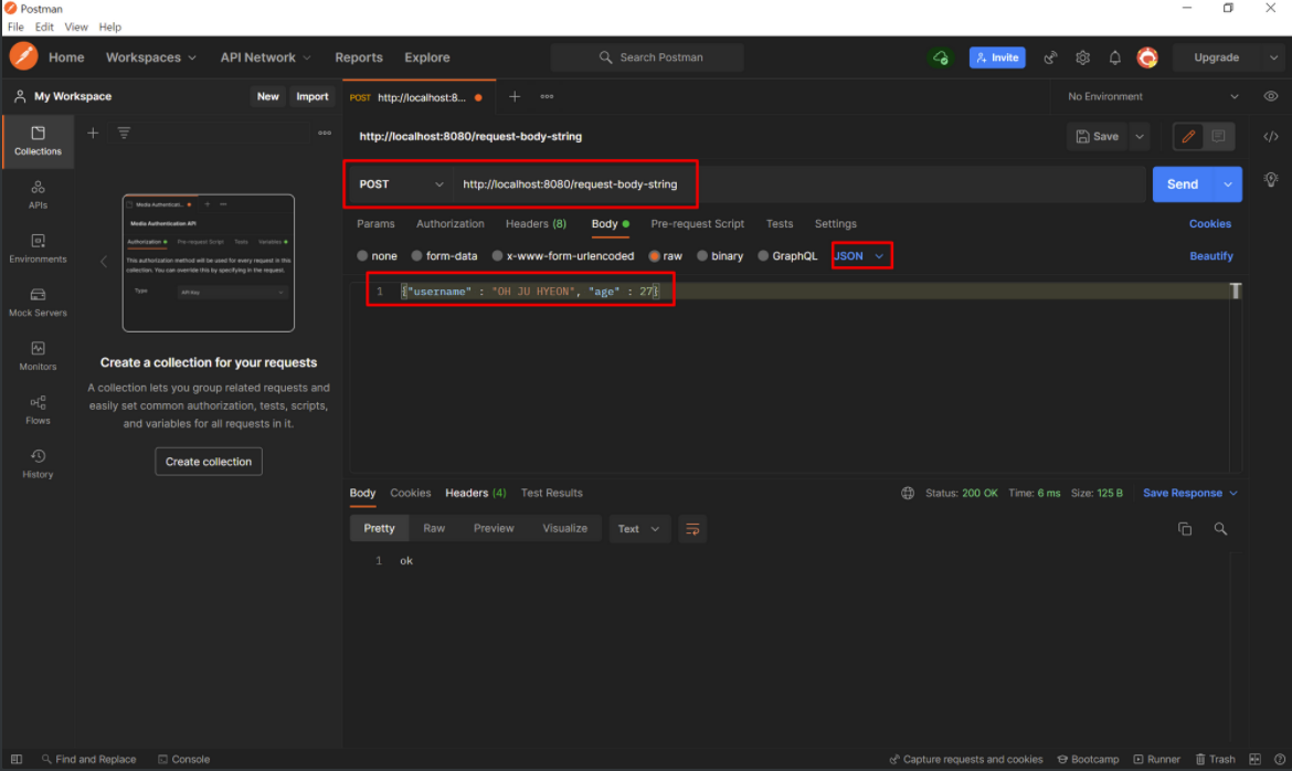 Postman을 통해 OH JU HYEON을 보내봤다.