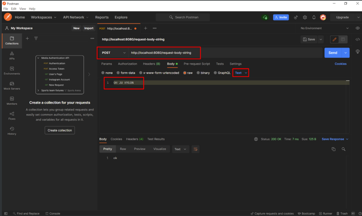먼저 간단한 TEXT 메시지를 HTTP 메시지 바디에 담아서 전송을 해본다.