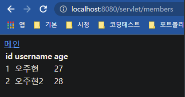 html 코드를 보면 이런 식으로 작성해 주었다. 여기서는 <% %> 대신에 <%= %>를 사용했는데 =표시가 들어간 코드는 안에 있는 내용을 출력한다는 뜻이라고 한다. 때문에 이렇게 실행했을 때 안에 있는 메소드가 실행되어 아이디, 이름, 나이를 불러오게 된다.