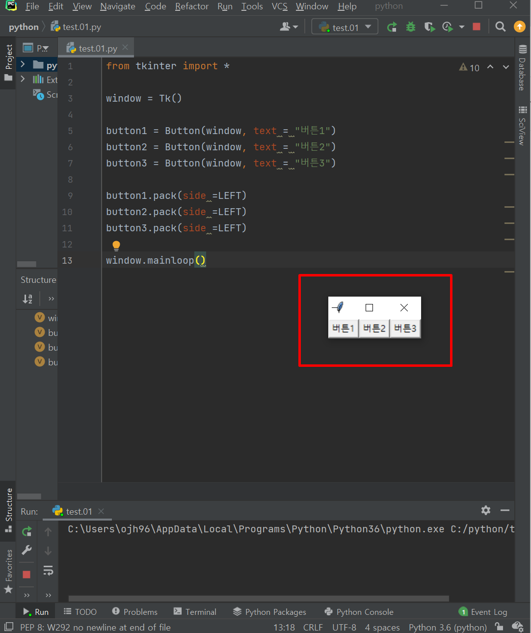 - 비어있는 리스트 3개를 준비하고 3번을 반복하면서 버튼을 생성한 뒤, 버튼 리스트를 화면에 출력했습니다.