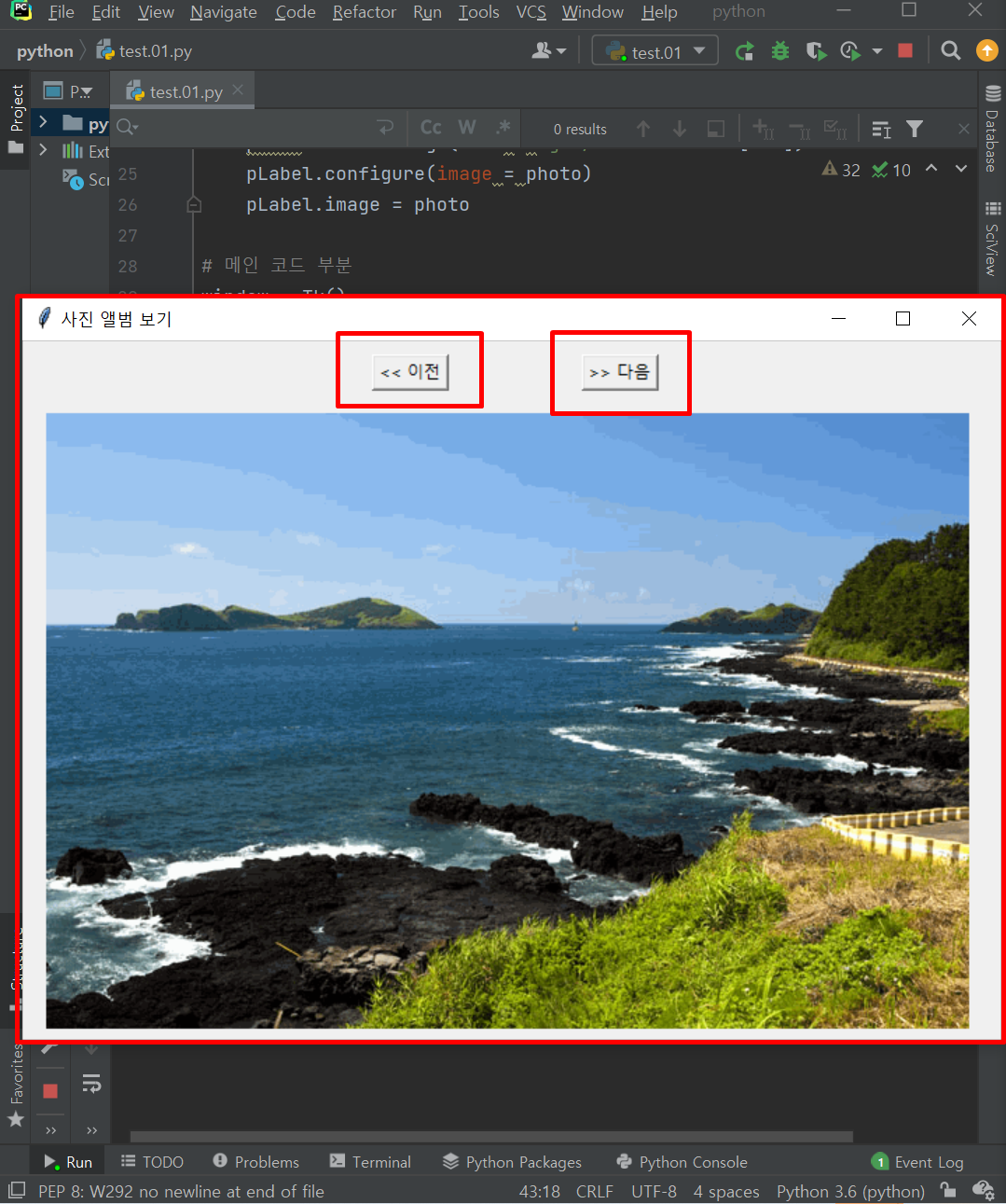 - 프로그램을 실행하고 처음 표시 될 사진을 설정하고 버튼 및 이미지 위치를 place()를 통해 지정해 줍니다.