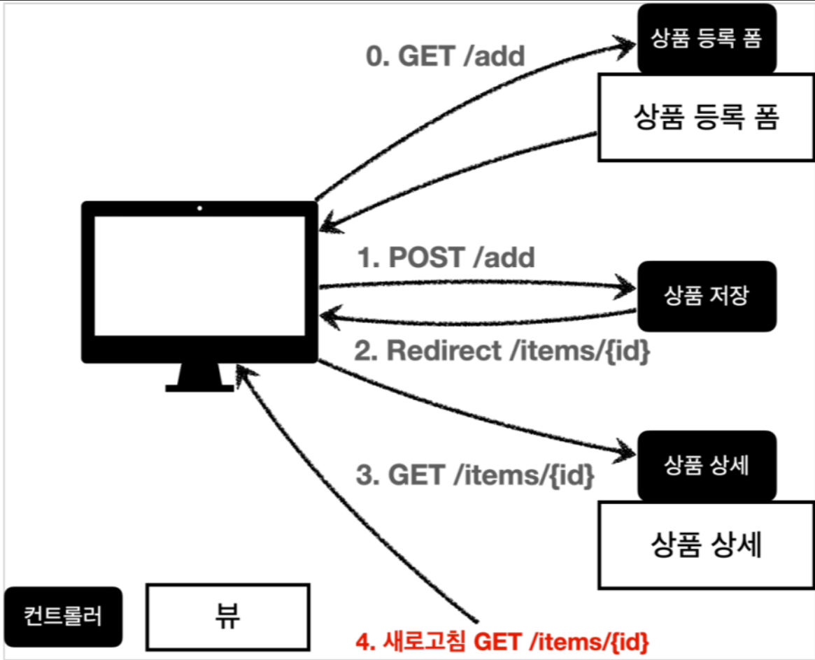 상품 등록 처리하고 뷰 템플릿이 아닌, 리다이렉트를 통해 상품 상세로 넘어가도록 해결한다. 이런 문제 해결 방식을 PRG라고 한다고 한다. Post, Redirect, Get 앞 글자를 따서 PRG.