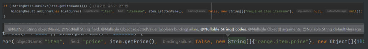 그다음은 FieldError가 제공하는 두번째 생성자를 통해 파라미터 값을 담아주었는데