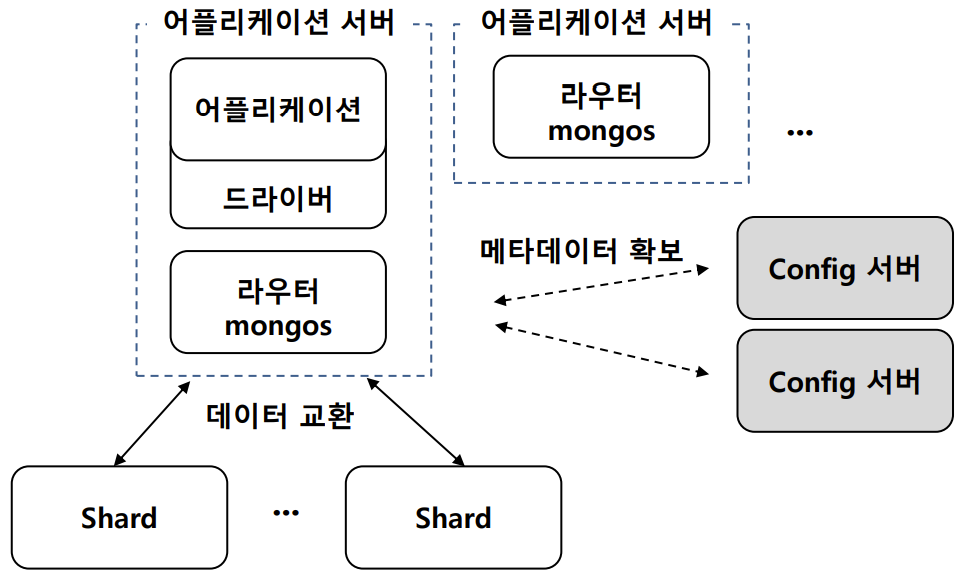 # MongoS(라우터)가 어떤 샤드를 통해 정보를 가져올지 정해주기 때문에 샤드는 라우터를 통해서만 애플리케이션과 정보 교환이 가능합니다.