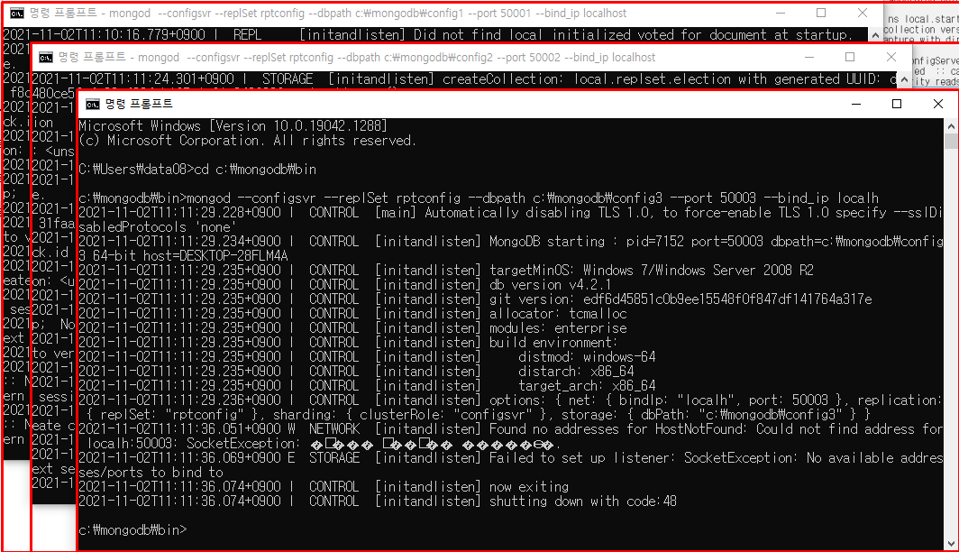mongod --configsvr --replSet rptconfig --dbpath c:\mongodb\config2 --port 50002 --bind_ip localhost