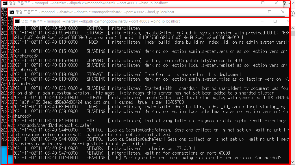mongod --shardsvr --dbpath c:\mongodb\shard2 --port 40002 --bind_ip localhost