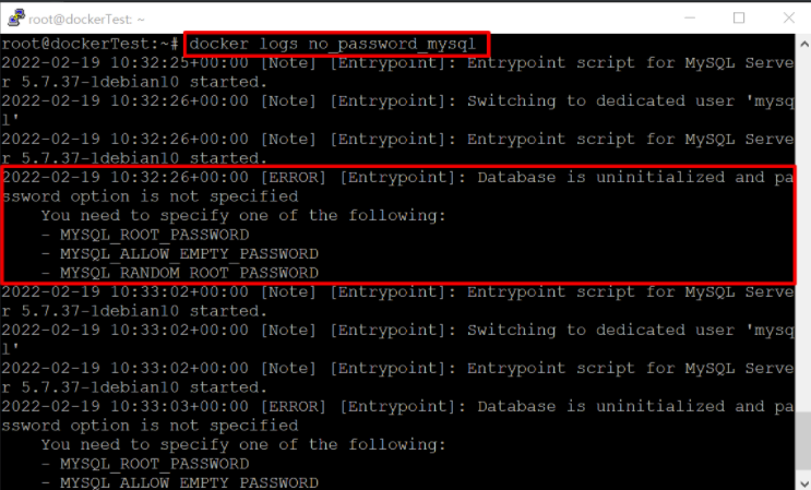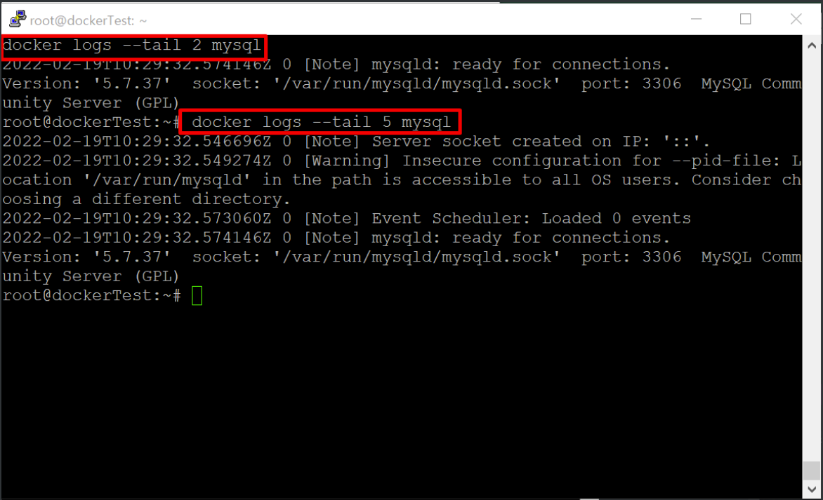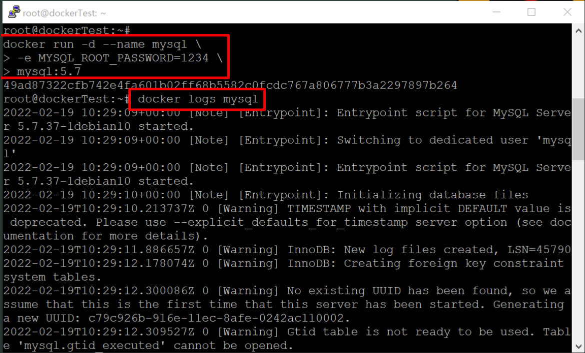 mysql을 구동하는 컨테이너는 포그라운드에서 실행이 되기 때문에 로그 명령어로 애플리케이션의 상태를 체크할 수 있다.
