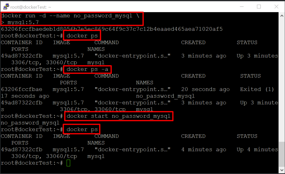 먼저 mysql을 하나 -d 명령어를 사용해서 하나 만들어주고 docker ps로 확인을 해 봤을 때 돌아가고 있지 않은 것을 확인할 수 있었고 docker ps -a를 실행했을 때 생성은 되어 있는 것을 확인할 수 있었다.