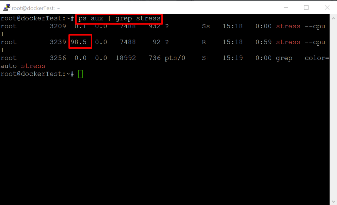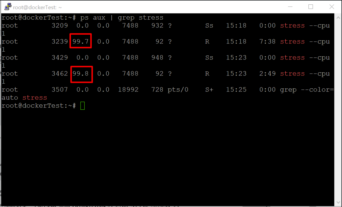위에서 생성한 컨테이너는 -d 옵션으로 생성되어 백그라운드에서 계속 CPU에 부하를 주므로 테스트가 끝나고 반드시 컨테이너를 삭제해야 한다.