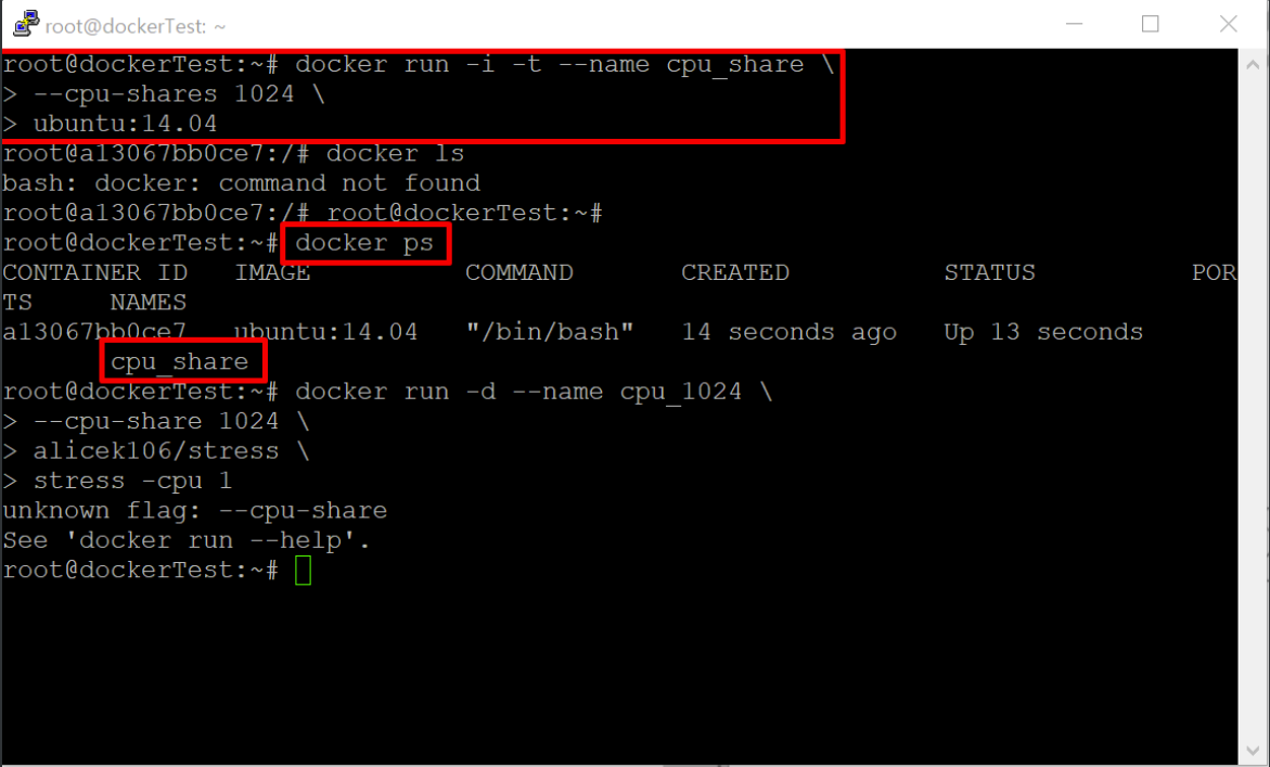 --cpu-shares 옵션은 컨테이너에 가중치를 설정해 해당 컨테이너가 CPU를 상대적으로 얼마나 사용할 수 있는지 나타낸다.