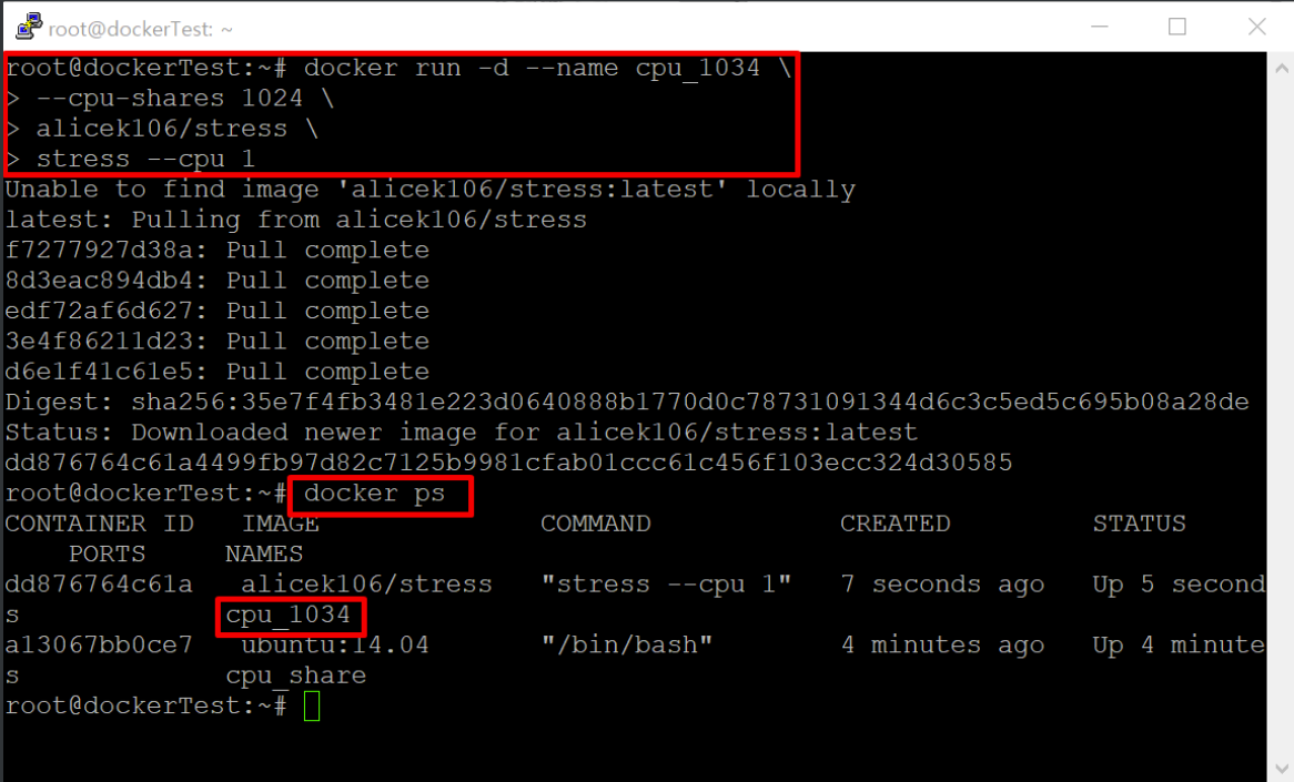 옵션으로 1024의 값을 할당하고 컨테이너의 명령어는 1개의 프로세스로 CPU에 부하를 주는 명령어(stress —cpu 1)로 설정을 해줬다.