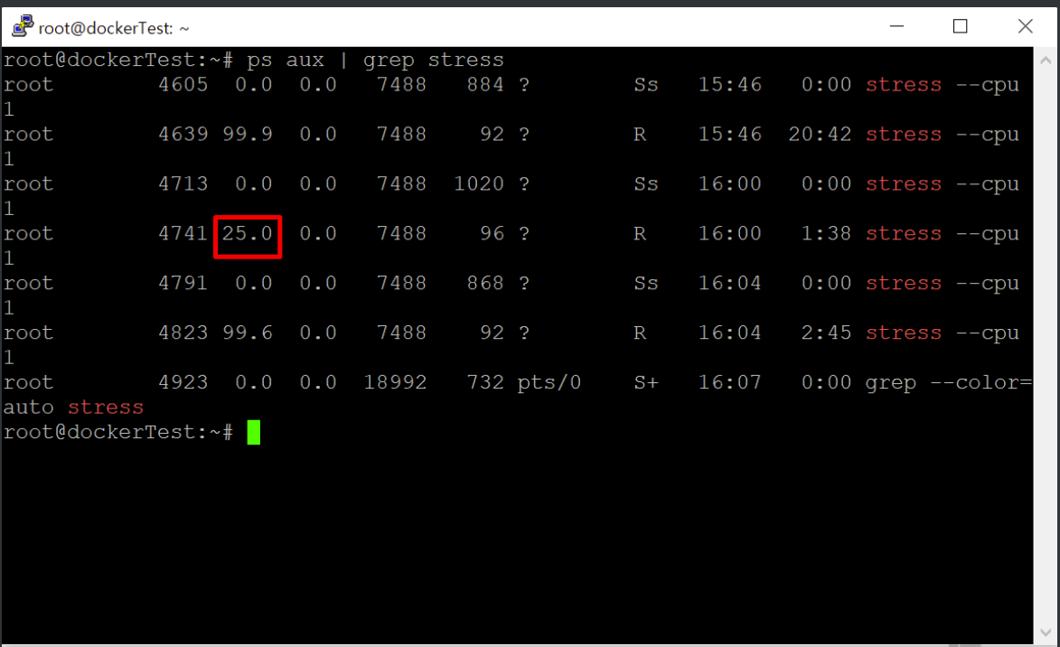 명령어로 CPU 할당량을 확인하면 첫 번째 컨테이너가 1/4만큼 CPU를 적게 사용하고 있는 것을 확인할 수 있다.