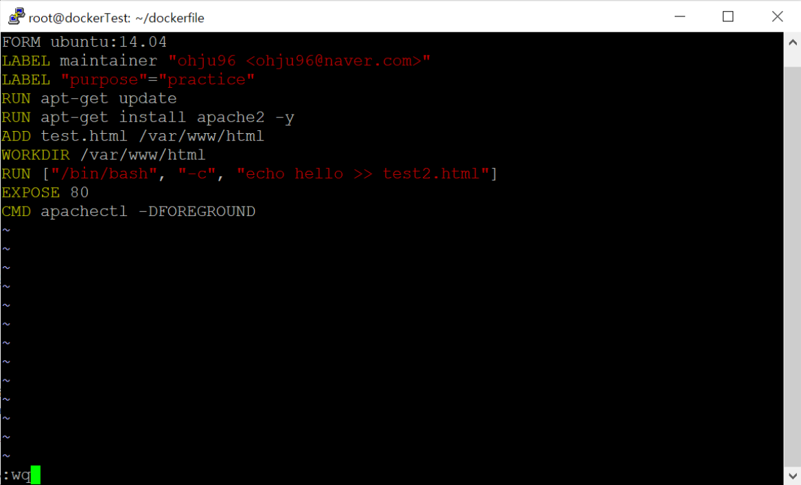 이미지에 아파치 웹 서버를 설치하고 로컬에 있는 test.html 파일을 웹 서버로 접근할 수 있는 컨테이너의 디렉터리인 /var/www/html에 복사한다.