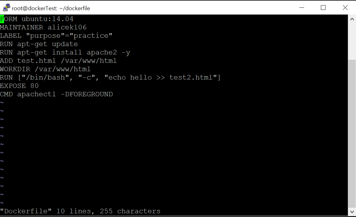 MAINTAINER를 통해 이름을 alicek106으로 설정하고 Dockerfile에서 생성될 이미지의 라벨을 purpose=practice로 설정한다.