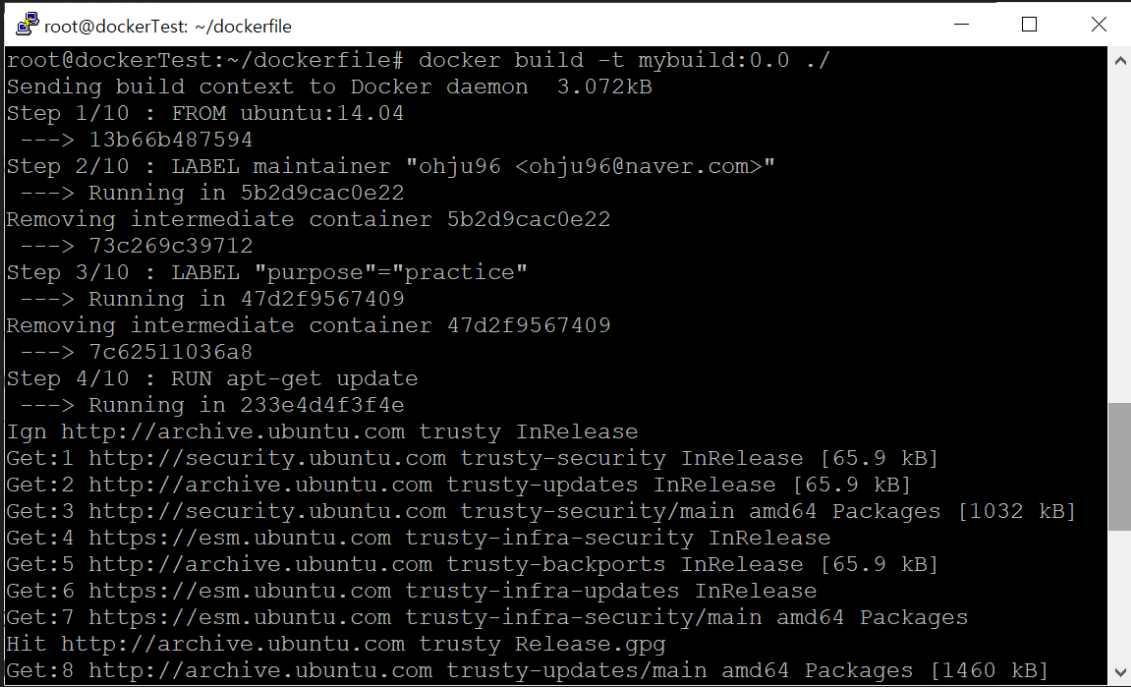 build 명령어이다. -t 옵션은 생성될 이미지의 이름을 설정한다. mybuild:0.0 이라는 이름의 이미지가 생성된다. -t 옵션을 사용하지 않으면 16진수 형태의 이름으로 이미지가 저장된다. -t를 꼭 사용해주자.