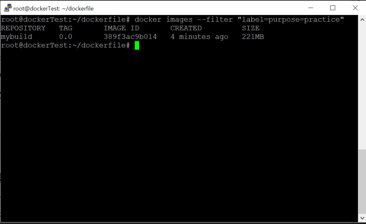 Dockerfile에 이미지 라벨을 purpose=practice로 설정했기 때문에 docker images 명령어의 필터에 이 라벨을 적용할 수 있다. 위 명령어는 —filter 옵션을 통해 위에서 생성한 이미지만 출력한다.