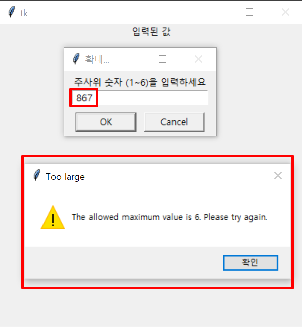 주사위 범위보다 큰 숫자를 입력하면 경고 문구가 뜨게 됩니다.