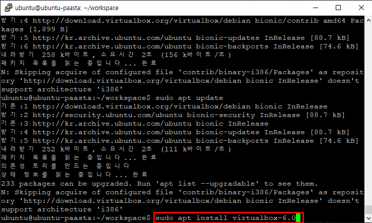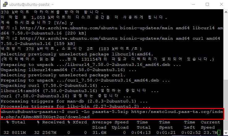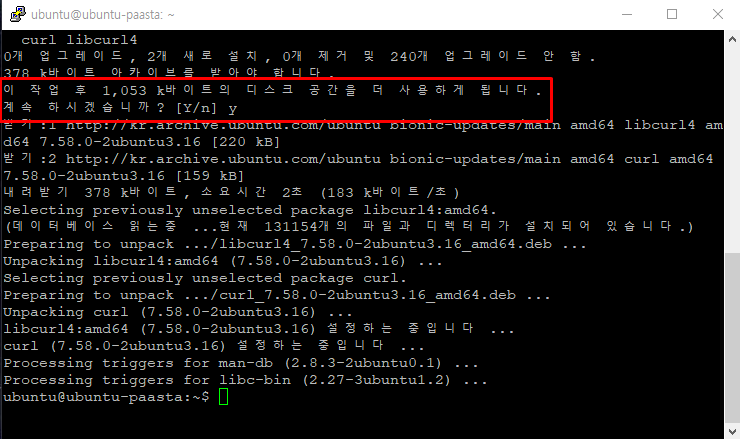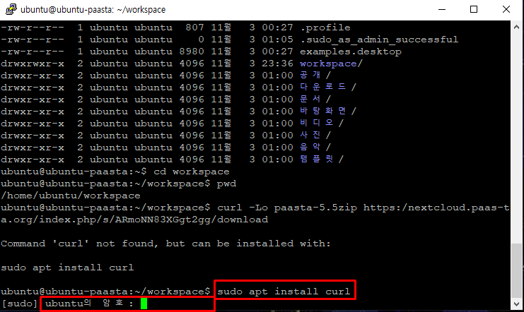 만약, curl 다운로드가 안 된다면 우분투를 재부팅하고 실행해 주면 됩니다.