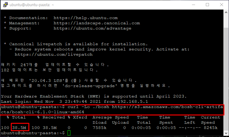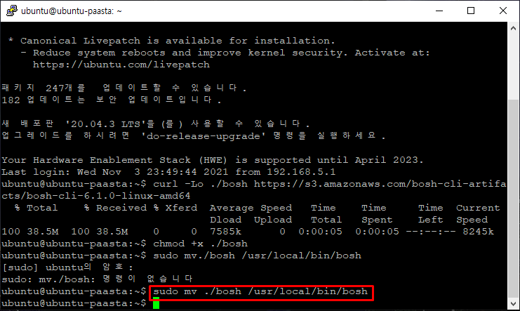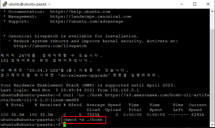 아마존 웹 서비스에 올라가 있는 Bosh cli 파일을 다운로드 받아줍니다.