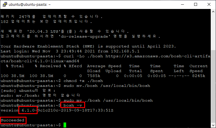 bosh가 잘 설치된 것을 확인할 수 있는 명령어 입니다.
