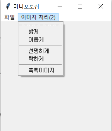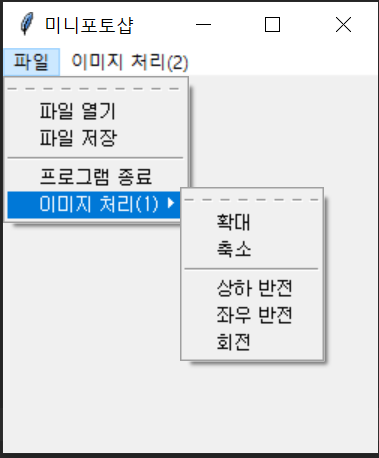 fileMenu.add_cascade(label = "이미지 처리(1)", menu = image1Menu)