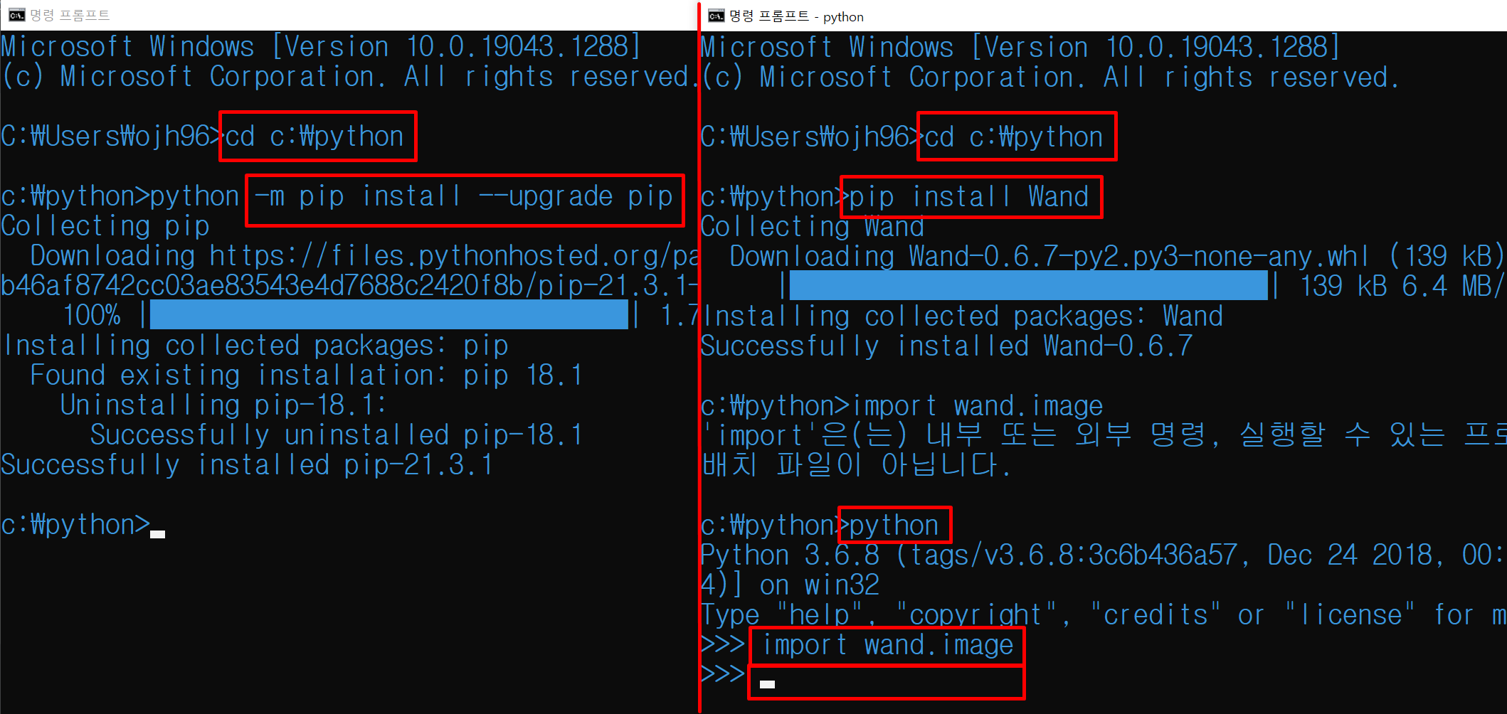 명령 프롬프트를 실행하고 pip upgrade를 해주고 Wand를 설치해 줍니다.