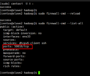 데이터 노드가 사용하는 포틍니 50010번 포트의 방화벽을 해제해야 한다.