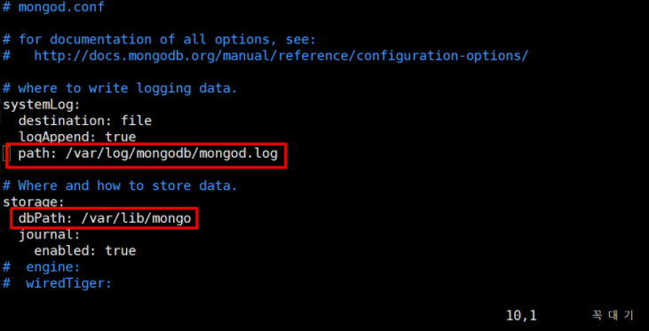 접근 제어, 저장소 등 MongoDB 환경 설정 파일을 설정하기 위해 편집기를 열어준다.