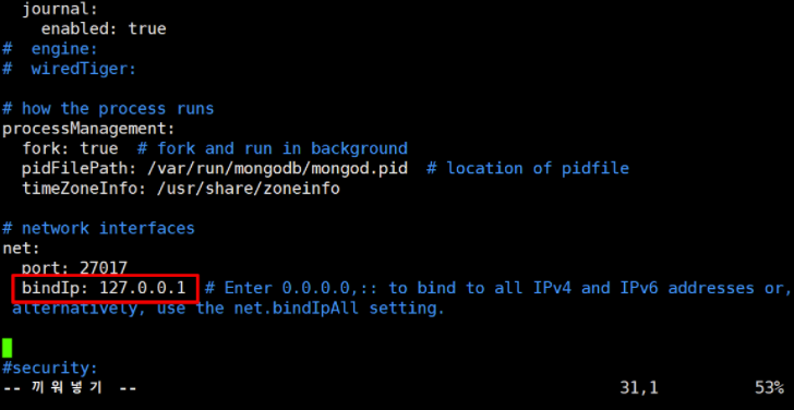 아래 bindIp를 설정할 수 있는데 이 부분도 수정이 필요하다.