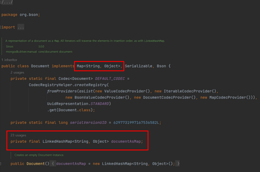 구현 방식은 LinkedHashMap을 사용하고 있어서 Document의 데이터 타입 변경은 Map으로 변환한 뒤에 변경이 가능하다.