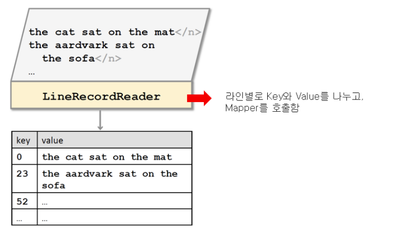 RecordReader를 더 엄밀히 말 하면 LineRecordReader로 라인별로 Key와 Value를 나누고 Mapper를 호출한다.